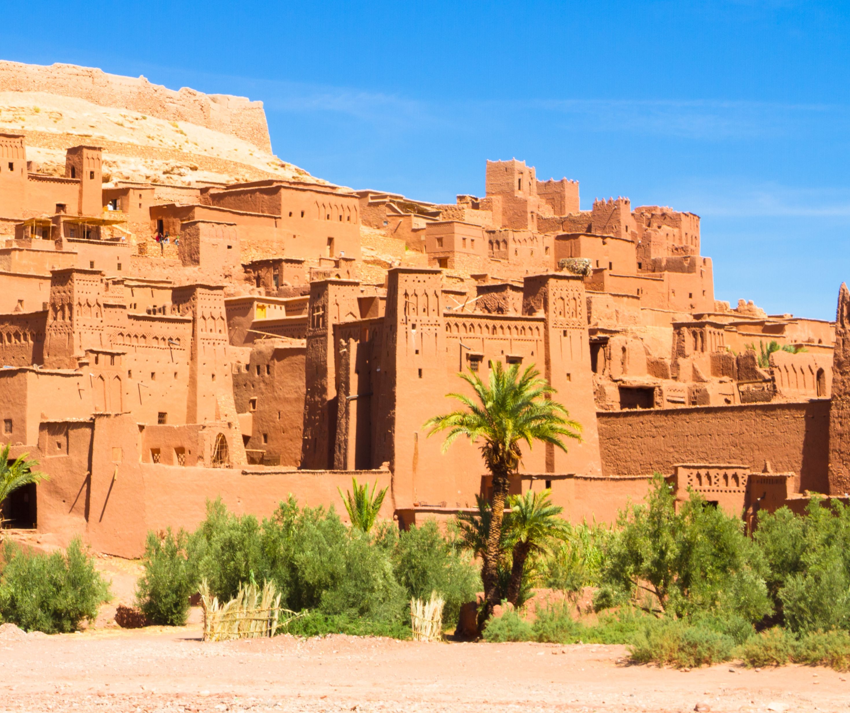 Po śniadaniu wyjazd w piękne góry Atlasu Wysokiego, najwyższe pasmo Afryki Północnej, ze szczytem Jebel Toubkal który liczy sobie ponad cztery tysiące metrów. Przejazd zapierającą dech w piersiach trasą poprzez Atlas Wysoki i przełęcz Tizi-n-Tichka na 2260 m p.p.m., gdzie wspaniałe widoki następują jeden za drugim. Przejazd do Ait Benhaddou. Spacer po największym marokańskim ksarze, dużej wiosce w całości zbudowanej z bitej gliny, na wzgórzu w niesamowitym pustynnym krajobrazie. Ksar ten jest na liście UNESCO, wiele znanych filmów było tutaj kręconych: Gladiator, Aleksander, Królestwo Niebieskie. Przejazd poprzez Ouarzazate do malowniczej oazy. Zakwaterowanie i kolacja w kameralnym, malowniczym hotelu.