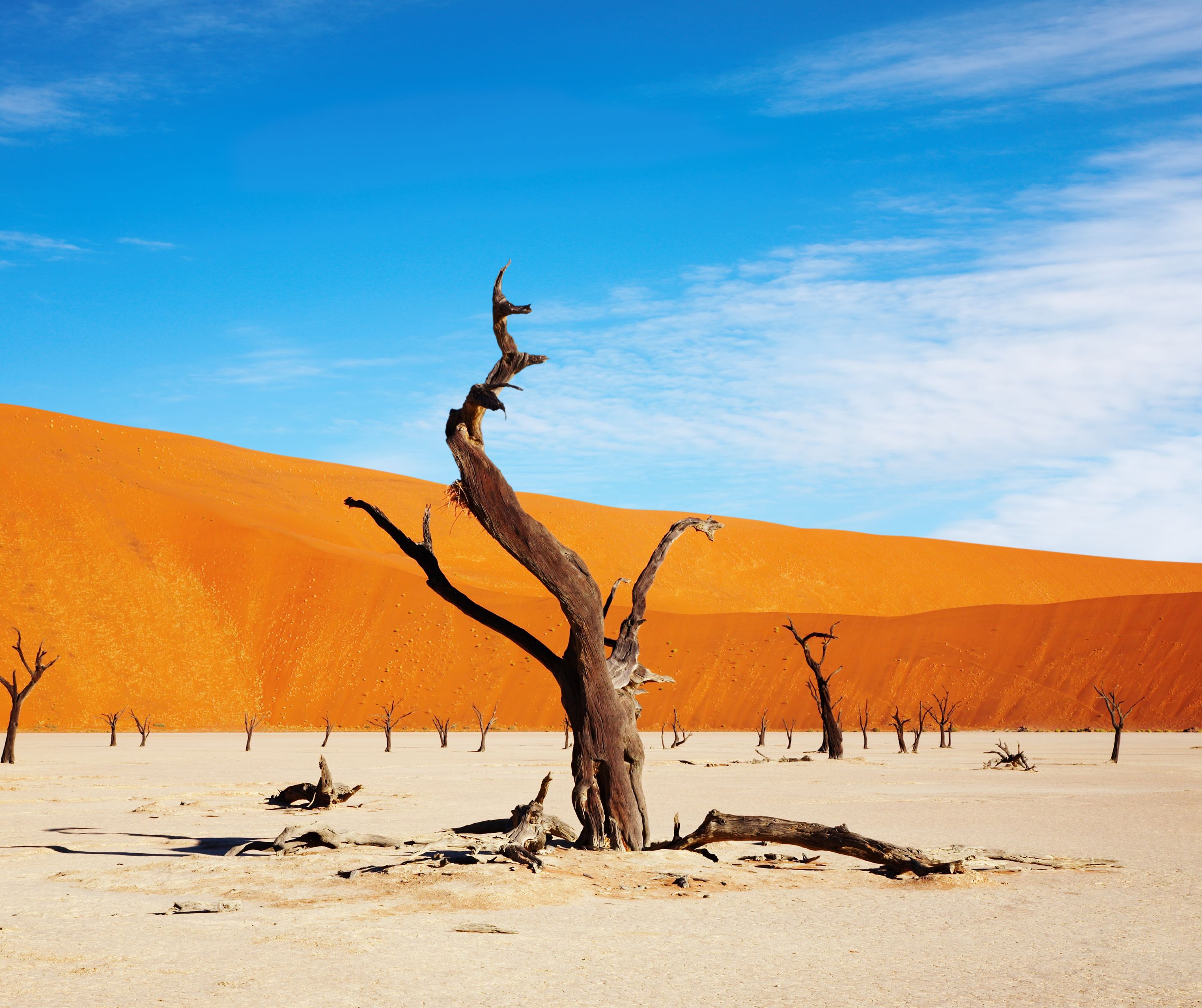 Kontynuujemy podróż zmierzając wzdłuż wybrzeża Atlantyku do portu Walvis Bay. Ten naturalny port od wieków przyciągał żeglarzy. Na pobliskich płytkich wodach okresowo żerują flamingi i pelikany. Na twarzach czujemy zimny powiew. Ocean na skutek prądu płynącego wzdłuż wybrzeży Namibii jest zimny i wybrzeże często jest spowite mgłami. Wjazd na obszar Parku Narodowego Namib-Naukluft. Mijamy rzekę Kuiseb i dojeżdżamy do Sesriem leżąca w sercu pustyni Namib. To jedno z najsuchszych miejsc na ziemi, a krajobrazy należą do najstarszych na naszej planecie. Przed zachodem słońca wycieczka do Sossuvlei. Wjeżdżamy w piękną scenerię najwyższych wydm świata. Zdjęcia z Sossuvlei znajdują się na wielu folderach promujących Namibię. Gdy wdrapiemy się na jedną z wydm, naszym oczom odsłoni się pustynia w pięknej krasie. Oglądamy też niewielki, ale malowniczy kanion. W tym dniu mamy szansę zobaczyć żyjące tu antylopy springbok i strusie. Nocleg w Sesriem lub okolicy.